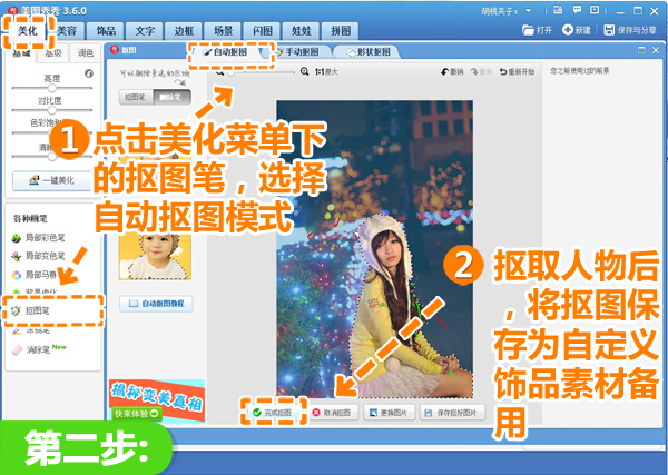 2、点击左侧的抠图笔,选择“自动抠图”模式,抠取人物后,将抠图保存为自定义饰品素材备用。