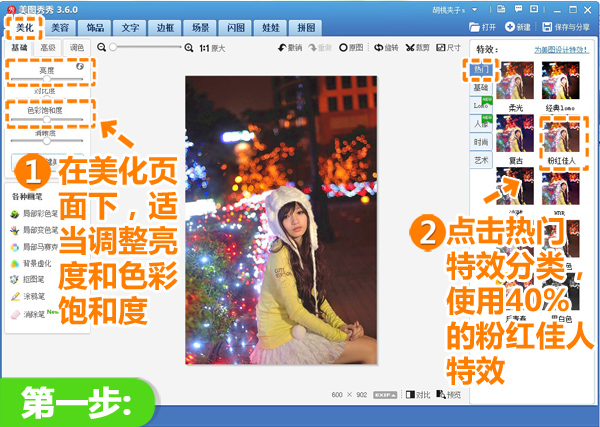 1、在“美图秀秀”软件中打开照片,根据照片程度,适当提高亮度和色彩饱和度;点击“热门”特效分类,使用40%的“粉红佳人”特效,提高整个画面的亮度。