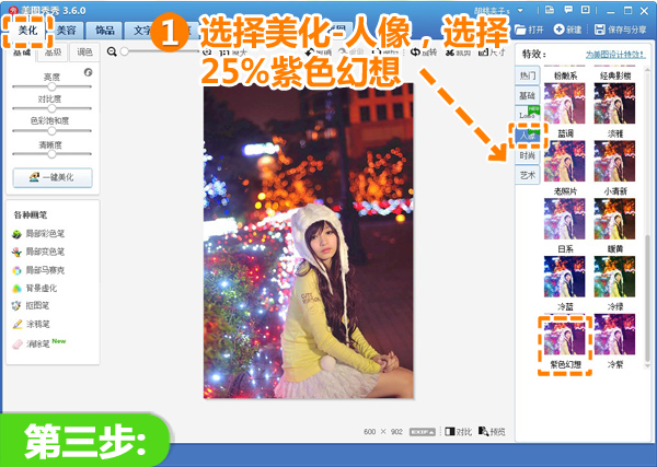 3、然后选择“人像”特效分类,选择25%的“紫色幻想”特效,使画面呈现出梦幻色彩。