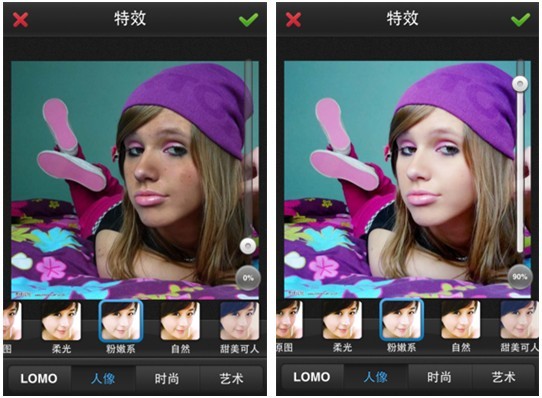 除了以上介绍的几种特效外,新增的“人像特效”中还有“自然”、“阿宝色”、“黑白”等多个特效,以满足不同MM的图片处理需求。另外,LOMO特效也进行了全面优化,效果更好,画质更佳,同样可以调节特效透明度,喜欢用特效打造不同风格照片的MM们不妨下载试试!