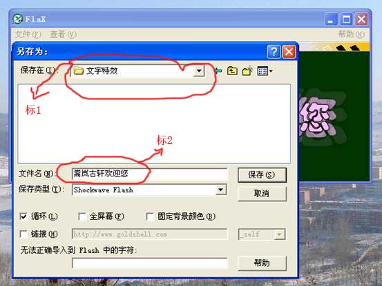 7. 导出特效:点击软件左上角的“文件”,(看图片1标8),下拉菜单中点击“输出为 SWF 文件”,出现图片2: