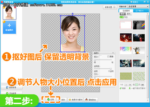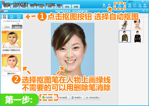 STEP1:在“美图秀秀”软件下,打开一张正面照片,点击界面右上侧的“抠图”按钮,选择“自动抠图”。在跳转出来的新界面中,按照左侧提示用抠图笔在人物上画绿线,即可轻松抠图人像。