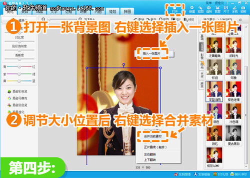 STEP4:接下来,再打开一张军旅风格的背景图,并右键选择“插入一张图片”,将刚才保存的PNG格式的图片导入进来,适当调节大小位置后右键选择“合并当前素材”。
