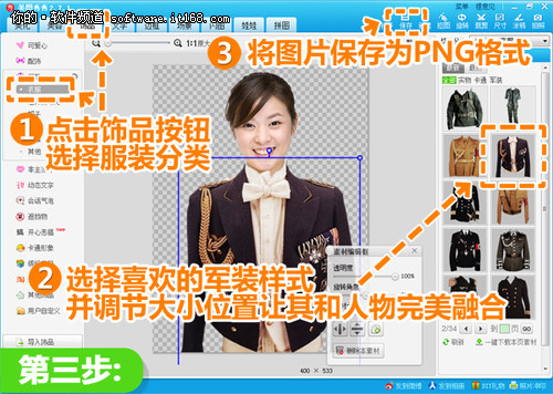 SETP3:接着进入“饰品”菜单下,选择“服装-军装”分类里,挑选一款喜欢的军装样式,要调节素材的大小位置,尽量让服装和人物完美的融合,还得注意头与脖子、肩宽的比例哦!设置好后,将图片保存为PNG格式。