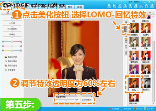 STEP5:最后为了让人物和背景能自然地融合,进入“美化”菜单下,给图片添加一个“LOMO—回忆”特效,可以根据需要适当调节特效的透明度,就大功告成啦!
