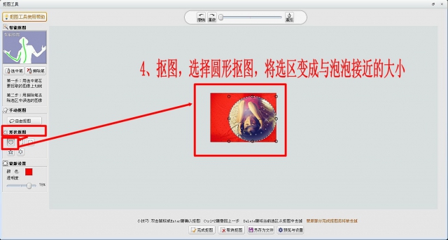 4、抠图:点击抠图,选择形状抠图-圆形抠图。调整抠图大小,使选区与泡泡大小接近