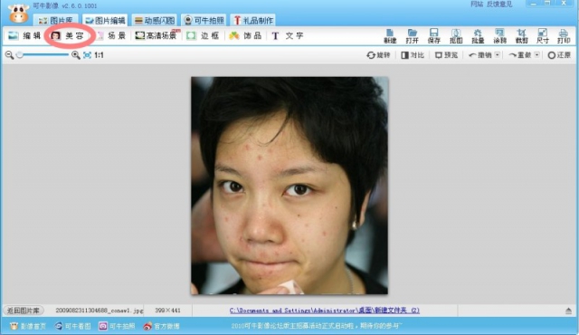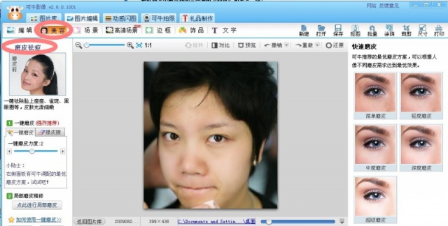 第二步:我们看到照片中的李宵云脸上有许多泛红的痘痘和黑色的痘印,看上去皮肤较差,且面色暗黄。首先要为宵云祛痘。执行“美容→局部磨皮”。利用小画笔对有痘痘的地方进行逐一点击祛痘。