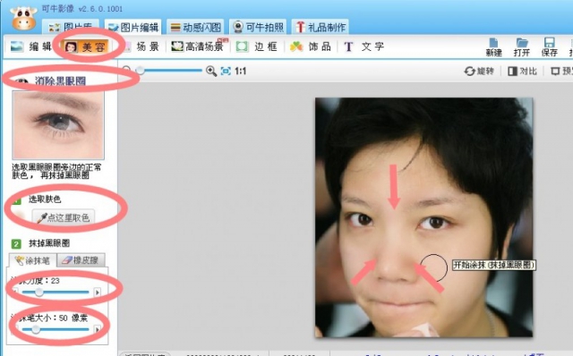 第四步:经过以上两步简单处理后,宵云的肤色仍然不够均匀水嫩。接下来牛牛将巧用“消除黑眼圈”功能,用全新办法祛痘。执行“美容→消除黑眼圈”,在选取肤色时最好取脸蛋上比较白皙的部分,并且利用小画笔均匀涂抹全脸。小编提示大家:注意将画笔力度调至20-25之间即可。