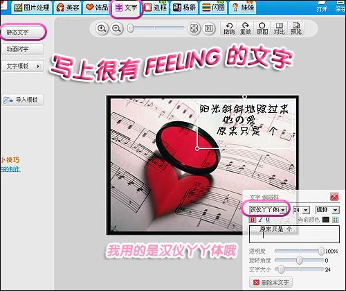 打开原图写上很有feeling的文字,文字模板里也有哦,亲们也可以键入静态文字。