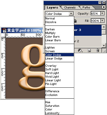 选择layer3的opacity为65%,然后选择filter / Blur / Gaussian Blur,写入模糊程度参数为1.7,然后选择属性的下拉菜单为color dodge。如图11所示。
