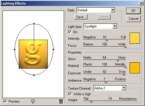 选择filter / Render / Lighting Effects,按图4所示的参数填入弹出的面板,两个颜色的代码分别是#FDD947和#FFC000。注意一定选择texture channel是alpha2。