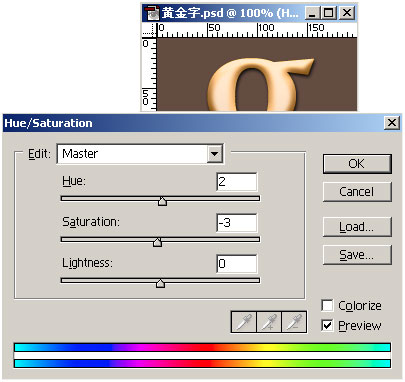 选择select / load selection,选择alpha1选区,然后选择layer / new adjustments layer / hue/saturation,按ok,轻轻调节三项参数,使之最接近黄金效果为止。按ok完成所有操作。如图12。