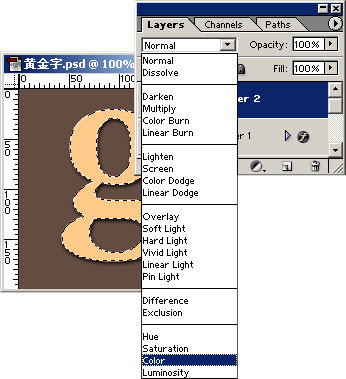 按alt + 后退键填充。再选择layer面板上方的状态栏下拉菜单,选择color.如图8所示。保证是继续选择的文字选区。