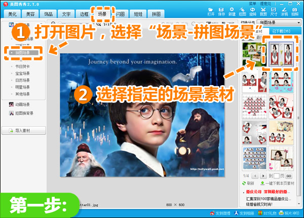 1、在“美图秀秀”中打开原图,进入“场景”菜单下,选择“拼图场景”,挑选一个合适的场景素材。
