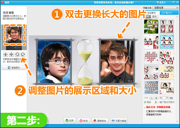 2、在进入拼图场景后,双击每一个图片区域进行更换图片,接着在左侧选框中调整图片显示的位置和大小。