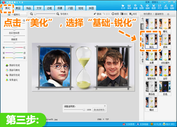 3、接着进入“美化”菜单下,选择“基础-锐化”特效,增强图片清晰度。然后点击保存,就大功告成了!