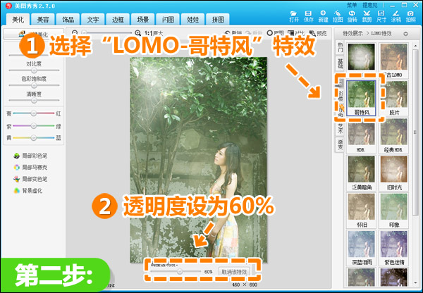 2.点击“LOMO特效”,添加一个透明度为60%的“哥特风”,使图片的绿色更富有生机。