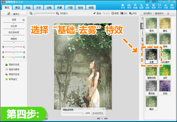 4.最后,选择“基础”特效下的“去雾”特效,减淡光晕,使光晕更自然,然后点击保存。