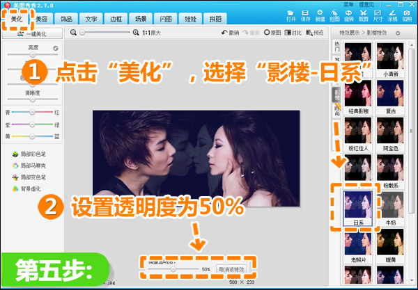 5.最后,点击“美化”,选择“影楼”特效里的“日系”特效,透明度设为50%,为图片增加一些特效,营造气氛。保存,大功告成!