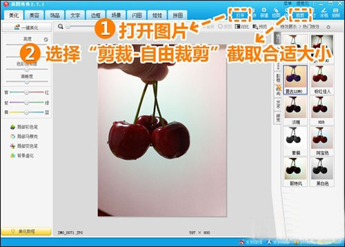 1、在“美图秀秀”软件中打开一张樱桃图片,为了突出作为“主角”的樱桃们,首先要选择“裁剪—自由裁剪”,截取合适的大小。