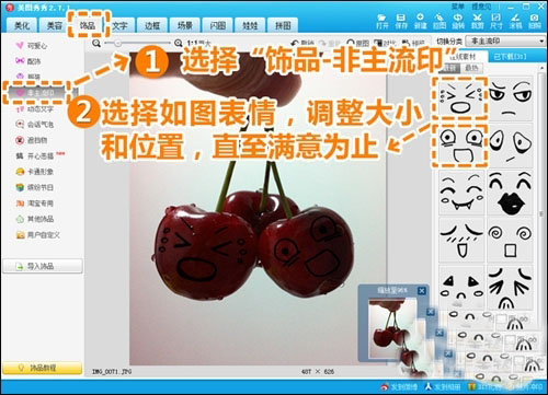 2、打开“饰品”菜单下的“非主流印”,选择两个合适的表情拖到樱桃上面,再适当调整表情的大小和角度,直到与原图契合。