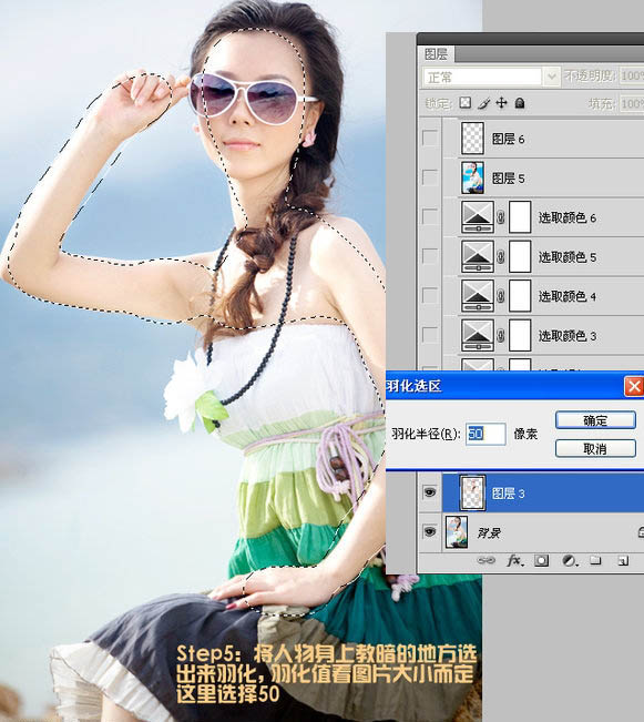 5、将人物身上较暗的部分选出来,羽化30个像素,按Ctrl + J 复制到新的图层。