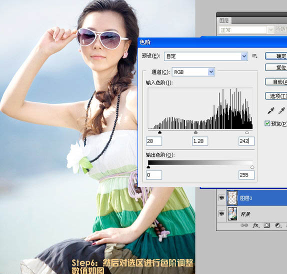 6、然后对肤色进行色阶调整,参数设置如下图。