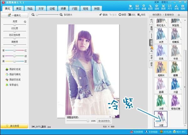 第一步:打开一张原片,进入“美化”菜单下,选择“影楼”分类中的“冷紫”特效。