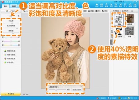 回到“美化”菜单,适当调高对比度、色彩饱和度及清晰度,并使用透明度为40%的“素描”特效。