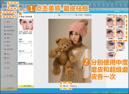 打开一张照片,点击“美容”—“磨皮祛痘”,分别使用“中度磨皮”和“超级磨皮”各一次。