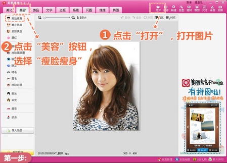 1、在“美图秀秀”软件下打开一张照片,点击“美容”菜单,进入“瘦脸瘦身”特效。