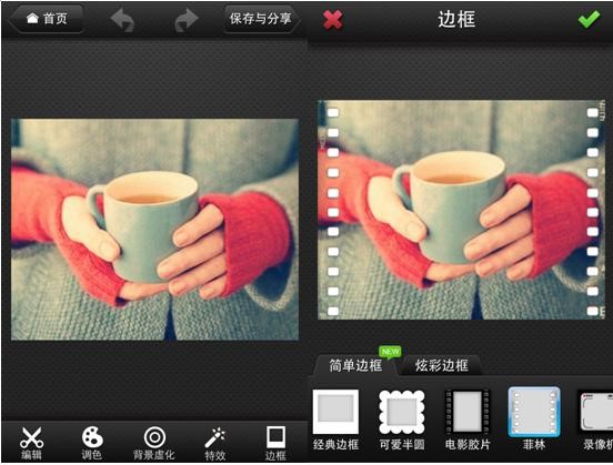 现在试试看为照片加上菲林边框的效果吧。在页面中选择“边框—简单边框”功能,在该标签页下手指滑动屏幕,从边框样式中选择“菲林”。选好后,点击编辑页面右上方的“√”按钮来保存此效果即可。