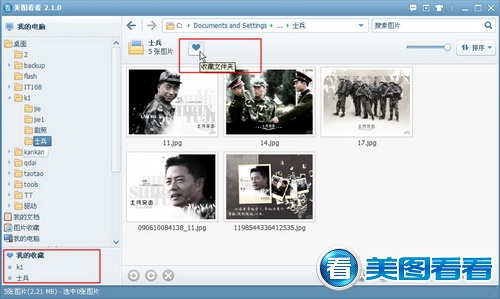 无意中发现了“丢失”已久的好照片,下次打开美图看看后能不能快速找到它呢?当然可以。如图03所示,浏览某个文件夹时单击界面上方“收藏文件夹”按钮,该文件夹即被收藏到界面左下方“我的收藏”中,作为浏览历史被保留。下次直接在此点击即可快捷进入,这就和网页浏览器的收藏夹一样,非常方便。