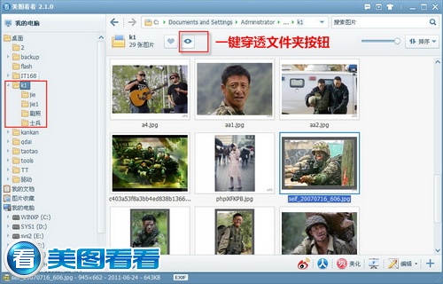 话说现在《士兵突击》又在央视8套重播了,小编想起之前存了N多《士兵突击》剧照图片在电脑上,也该拿出来再翻翻回味下。借着这个机会,小编就为大家演示一下美图看看的一键穿透文件夹功能。说干就干,打开美图看看进入图片文件夹,点一下“穿透文件夹”按钮,此图片文件夹下所有文件目录中的图片,都可以一键完全显示出来,如图01所示。