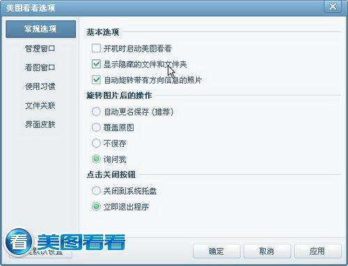 温馨小提示:设置了隐藏属性的图片可以在美图看看中显示出来哦,打开美图看看的主菜单,选择工具-选项设置,在“常规选项”下勾选“显示隐藏的文件和文件夹”一项即可,如图02所示。