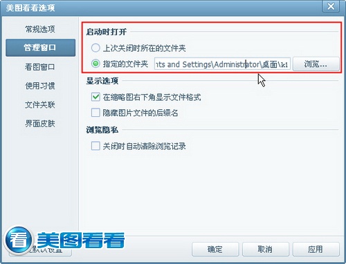 最后再给各位说点小技巧:假如某个图片文件夹需要经常查看,为了更方便的进入,咱们可以在选项设置对话框的“管理窗口”中,在“启动时打开”属性框中根据需要配置相应的访问方式,比如指定一个图片文件夹,如图04所示;这样,每次启动美图看看,即会自动进入此图片文件夹并显示出其中的所有图片了。