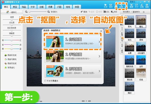 1.在“美图秀秀”中打开原图后,点击“抠图”,选择“自动抠图”。