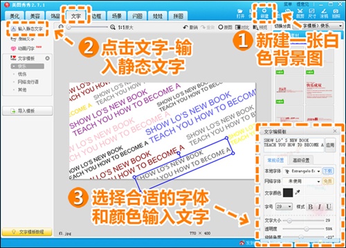 2.新建一张合适大小的白色背景图,点击“文字—输入静态文字”,添加一些装饰性文字。