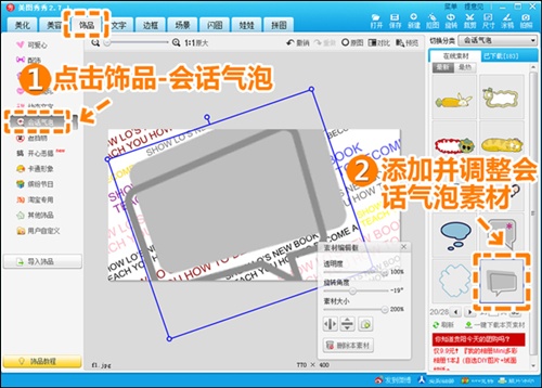 3.点击“饰品—会话气泡”,选择一个你喜欢的会话气泡素材添加进去,调整角度和大小。