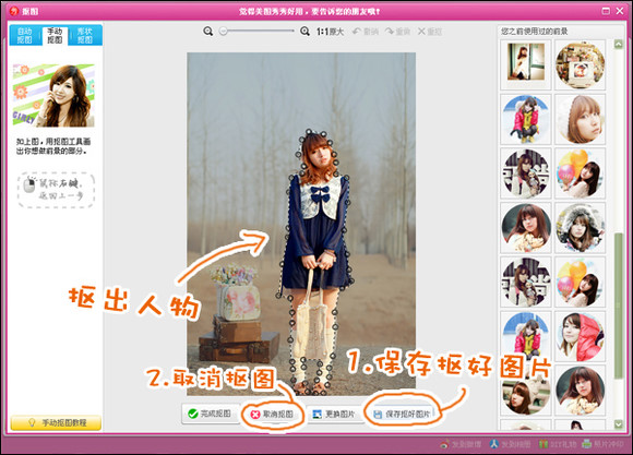 第二步:在跳转出来的抠图界面中,将人物抠取出来,很简单,只需用鼠标绕人物一周即可。抠好后别忘记点击“保存抠好图片”,将抠好的图保存到电脑中。