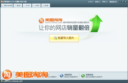 如图03所示,批量导入宝贝图片,美图淘淘预处理机制同样省心;进入软件主界面,图片处理、素材、文字、边框等功能标签,可让卖家们轻松完成漂亮素材效果的添加,一键即得。
