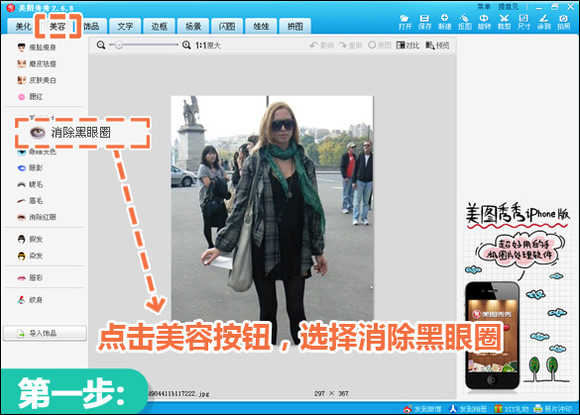 1、启动“美图秀秀”软件,直接进入“美容”菜单选择“消除黑眼圈”功能。