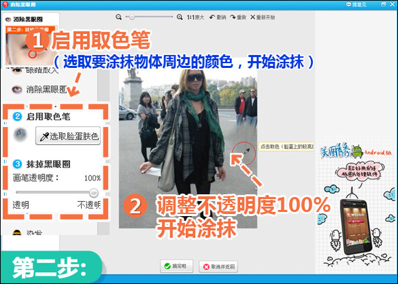 2、在跳转出来的界面中,先启用“取色笔”,在路人周围取色,并将画笔透明度调为100%,开始在路人身上涂抹。原理就是用周边景色来取代路人,所以修复过程中要在周边不断的取色来反复涂抹。