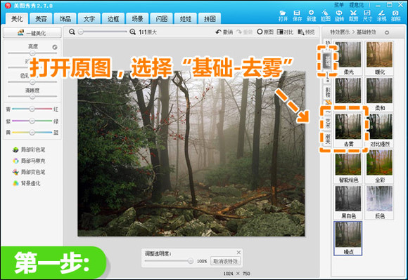 1.在“美图秀秀”软件中打开原图后,选择“美化—基础”下的“去雾”特效。