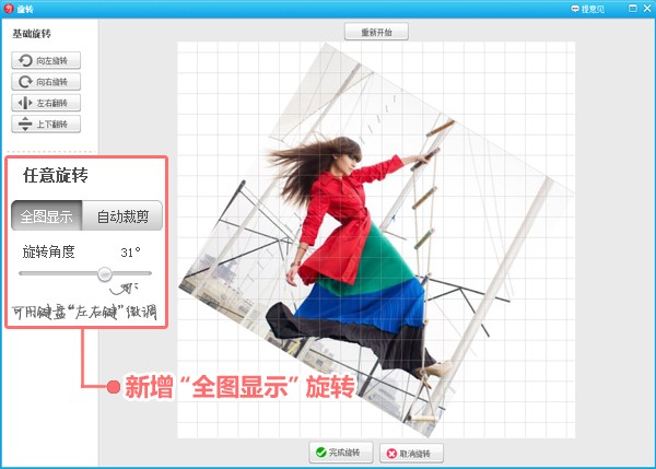 此功能直接将原图置于一块稍大的空白画布上,按鼠标左右调整“旋转角度”就可以任意的调整了。