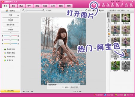 第一步:在“美图秀秀”软件下打开一张图片。在“美化”菜单下选择“热门—阿宝色”,给照片赋予淡橘色的人物肤色和偏青色的背景色调。