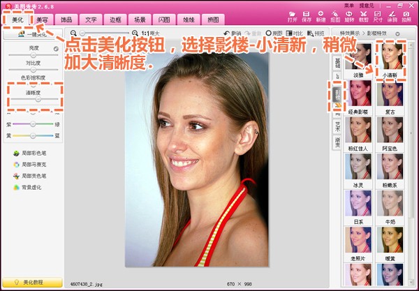 1.用“美图秀秀”打开照片后,在“美化”菜单下选择“影楼—小清新”特效,在左侧稍微将清晰度稍微调大一点,提亮画面。