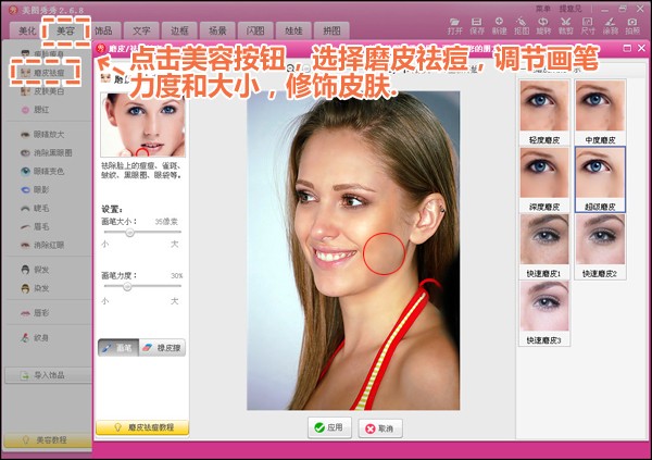 2.接着在“美容”菜单下,选择“磨皮祛痘”功能,调整画笔的大小与力度,修饰皮肤。