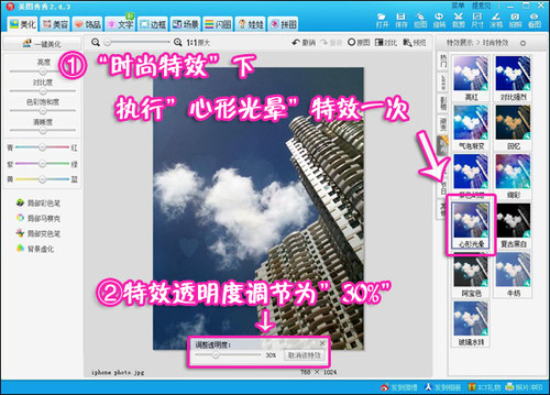 2、接着进入“美化”菜单下,在“时尚”特效分类下,执行一次“心形光晕”,并且将该特效透明度调至30%。
