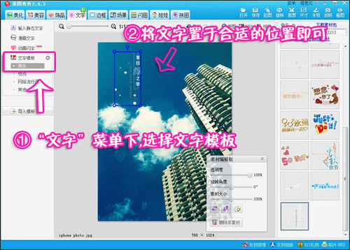 7、最后到“文字”菜单下,选择一个好看的文字模板,加在照片的合适位置上,就大功告成啦!